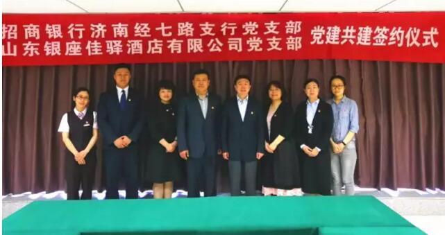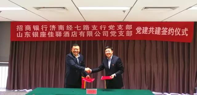 近日,银座旅游集团佳驿酒店公司党支部与招商银行济南经七路支行党支部举行党建共建签约仪式。招行经七路支行党支部书记、行长董健,纪检委员、副行长王茜,佳驿公司党支部书记、总经理王涛,纪检委员、总会计师房爱华等参加了活动。