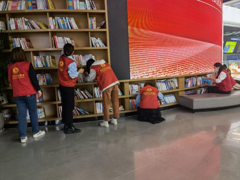 图片正值“世界读书日”,为增强主动服务意识,党员干部们在读书分享结束后自发开展了志愿服务活动,明确分工、相互配合,将新到图书按规定流程分类上架,并将散乱书籍按类别和编号进行排查整理放回对应的位置,最后进行了全方位打扫,为读书爱好者们创造了干净舒适的阅读环境。