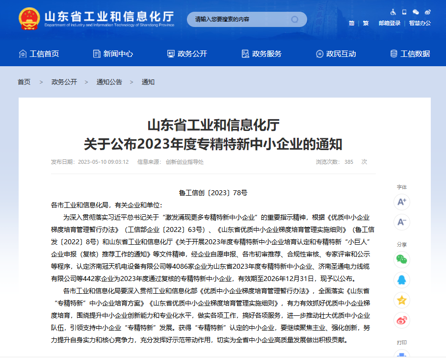 据了解,专精特新中小企业是指在产品、技术、管理、模式等方面创新能力强、专注细分市场、成长性好的中小企业,是推动经济社会发展的重要力量。根据相关文件精神,省工业和信息化厅组织开展了2023年度专精特新中小企业培育认定和专精特新“小巨人”企业申报(复核)推荐工作。经企业自愿申报、各市初审推荐、合规性审核、专家评审和公示等程序,认定4086家企业为山东省2023年度专精特新中小企业、442家企业为2023年度通过复核的专精特新中小企业,有效期至2026年12月31日。