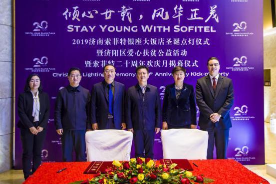 11月22日,济南索菲特银座大饭店精心打造了一场独特的法式主题点灯仪式,为酒店20周年欢庆月揭开精彩序幕。现场,济南索菲特银座大饭店与济阳区旅游促进服务中心共同启动济阳区爱心扶贫公益活动。
