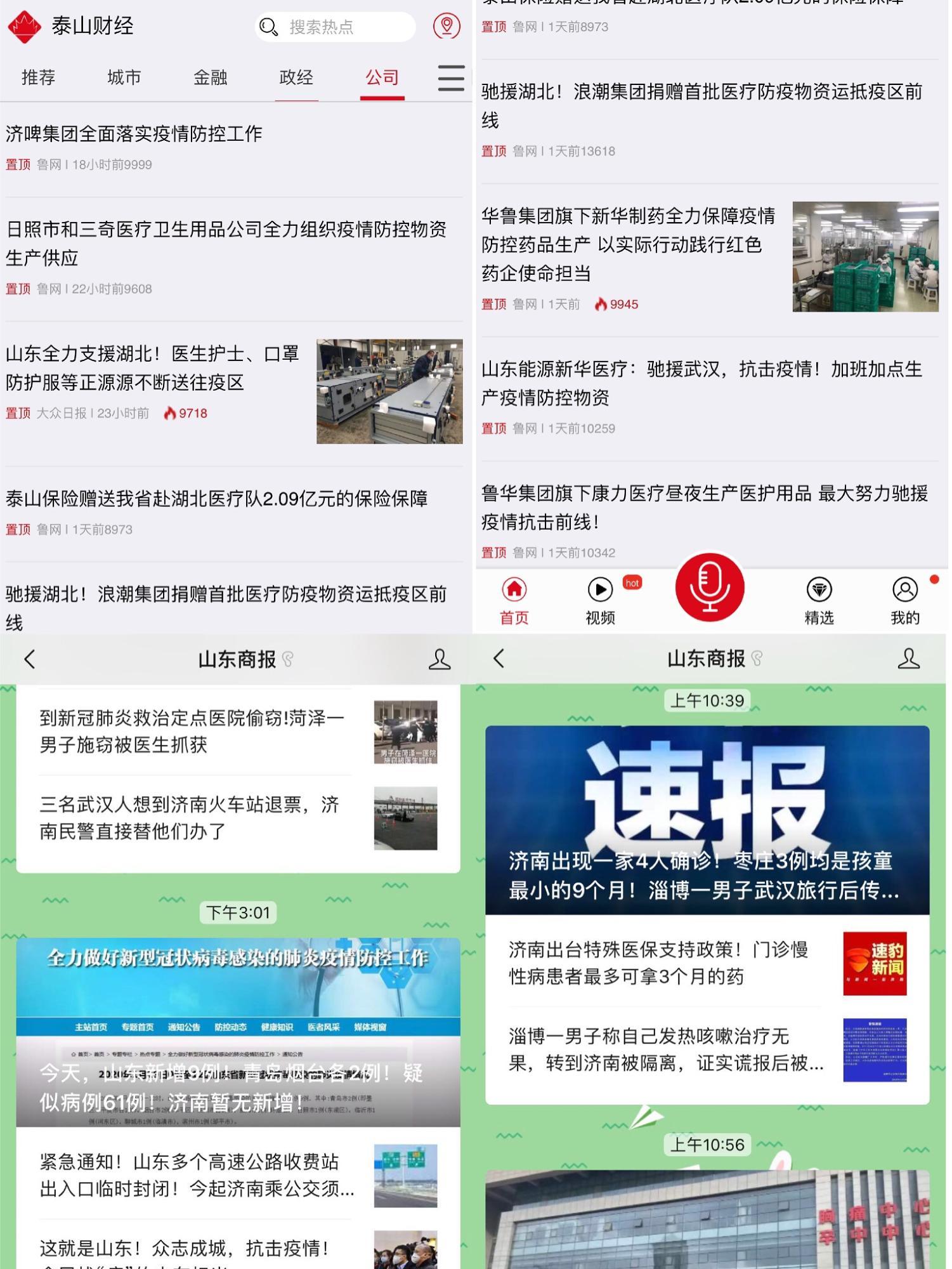 山东商报和鲁网官方微信紧急争取到由一日三次推送增加至一日八次推送的权限,实现了疫情防控特殊时期重大节点重要新闻的及时推送。鲁网一直处于24小时在线工作状态,在网站和泰山财经客户端开设抗击疫情专题,实现了疫情相关新闻的不间断更新;速豹新闻客户端开设抗击疫情专栏,与山东驰援武汉医护人员保持联系,推出了“前方日记”,采写了大量感人至深的报道。