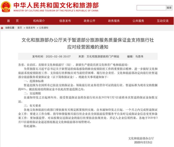 2月6日晚间,文化和旅游部办公厅发布《关于暂退部分旅游服务质量保证金支持旅行社应对经营困难的通知》(以下简称《通知》),决定向旅行社暂退部分旅游服务质量保证金(以下简称保证金)。