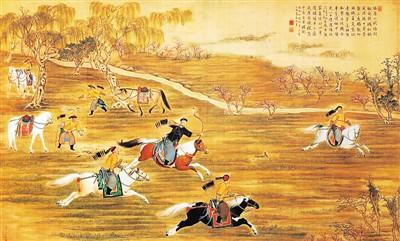 北京丰台南苑地区曾经水系发达、草木丰美,具有“野趣”历史生态风貌特征。图为清代《乾隆皇帝射猎图》描绘的南苑地区画面。