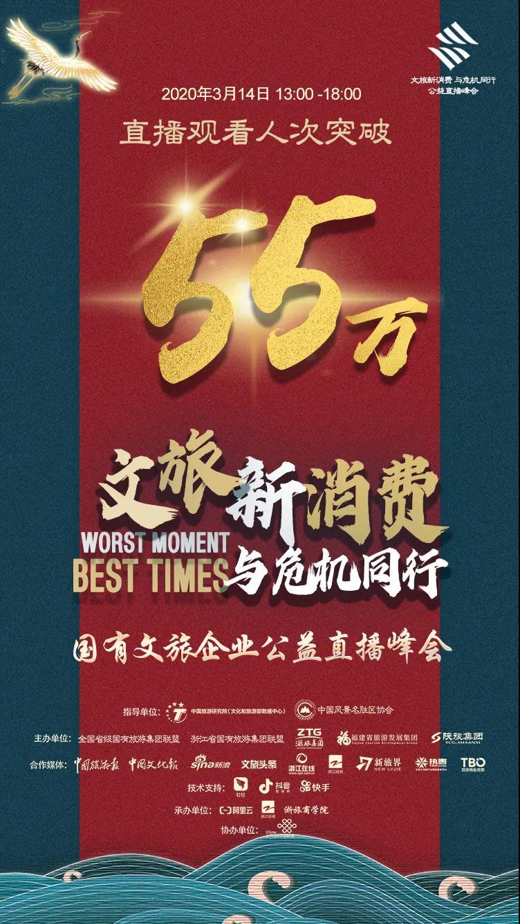 本次峰会由中国旅游研究院、中国风景名胜区协会指导,浙江省旅游集团、福建省旅发集团、陕西旅游集团联合全国省级国有旅游集团联盟、浙江省国有旅游集团联盟共同举办。通过钉钉、阿里云、淘宝大学云课堂、今日头条、文旅新零售在线课堂、浙江蓝TV、目睹直播、浙旅商学院等35个平台在线直播,共55.1万人次观看直播。