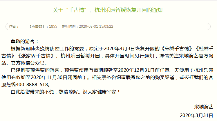 据宋城演艺3月31号公告,根据新冠肺炎疫情防控工作的需要,该公司原定于2020年4月3日恢复开园的《宋城千古情》《桂林千古情》《张家界千古情》、杭州乐园暂缓开园,具体开园时间另行通知。