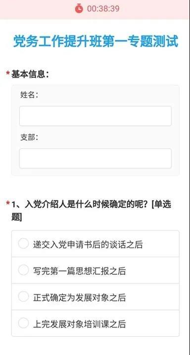 “发展党员全流程排序”“培养联系人有哪些任务”,会上,结合前期学习内容开展在线测试检验学习成效。测试期间,各支部党务工作者踊跃答题,争当学习标兵,并及时晒出成绩单,以测促学,以学促行,用优异成绩为党建标准化打下坚实基础。