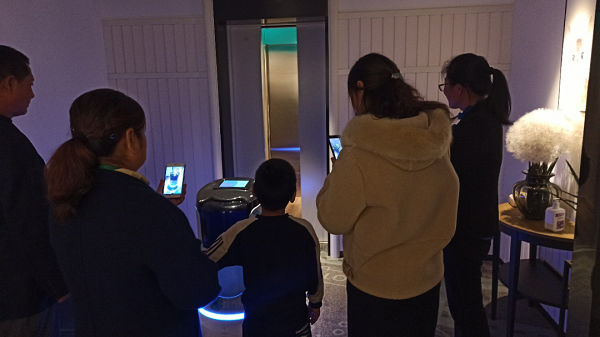 活动中,店长带领父母们参观酒店,了解员工拼搏奋战的地方,展示公司产品升级换代的新成果和广阔的发展前景。在酒店智能客房中,店长耐心介绍着智能客控设备的便捷操作。机器人服务员的“聪明、贴心”立刻吸引了大家的眼球,大家纷纷拿出手机拍照录像,现场响起一片赞叹声。