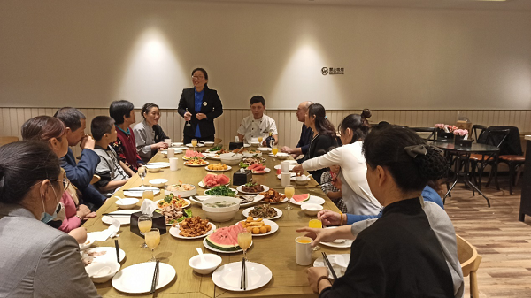 前台员工李鑫的公婆年近六十,六岁的儿子从小一直由公婆带着,正因为如此,李鑫才能全副精力做好前台的管理工作,表现优秀,赢得同事、顾客的一致认可。客房员工郑兆燕的婆婆今年七十多了,身体很健朗,老人朴实地说着她们婆媳住在一起十几年从来没红过脸,给大家传授婆媳相处之道。团圆饭席间大家互相敬酒、祝福,氛围和谐、温馨。