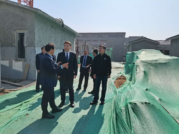 在鲁商乡村振兴学院培训中心配套项目工地,鲁商九女峰(泰安)乡村振兴有限公司总经理于在武对项目进行了介绍,山东文旅酒店集团一行进行了现场勘察,并从未来运营管理的角度就项目功能设计、动线规划等提出建议。