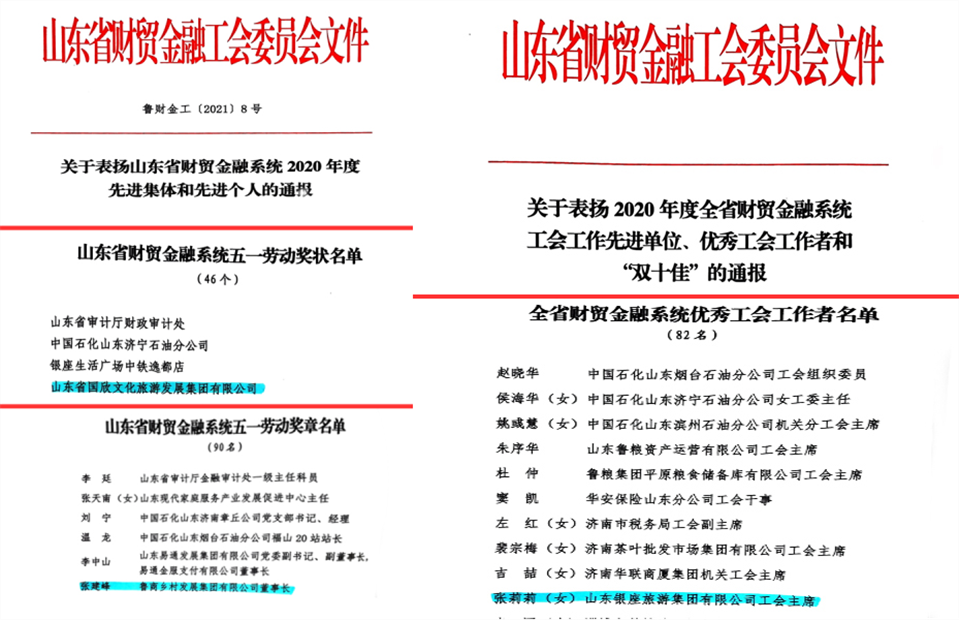 3月31日,山东省财贸金融工会一届三次委员会议在济南召开,国欣文旅在表彰中荣获“山东省财贸金融系统五一劳动奖状”,乡发展集团董事长张建峰荣获“山东省财贸金融系统五一劳动奖章”,文旅酒店集团工会主席张莉莉荣获“2020年度全省财贸金融系统优秀工会工作者”。