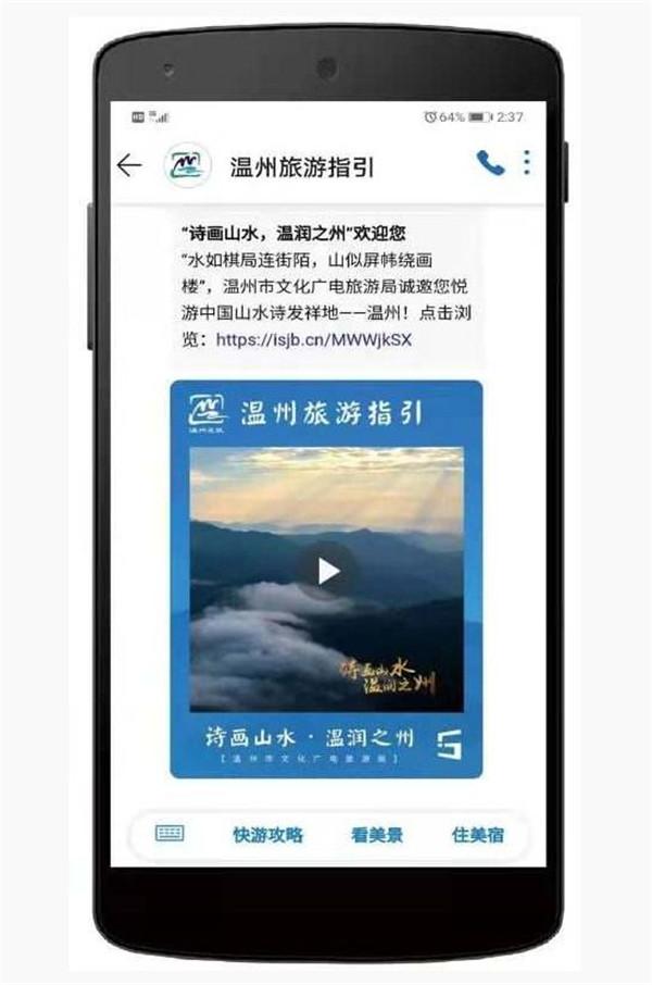 自《温州旅游指引》上线以来,引起了用户的广泛关注,在文旅行业也成为热门话题。来温参加“诗画温州,温润之州”长三角职工疗休养交流大会的上海用户徐先生说,我到温州雁荡山参加疗休养交流大会,一下动车就收到温州文旅推送的“诗画山水,温润之州—欢迎您”手机消息,感觉不错。以前到过很多城市,收到过文字版的欢迎短信,这次在温州收到的这种带高清视频的消息,体验感更好,获取的信息更全面,点击翻阅里面内容,也正是我想了解的。其中的“美景”“美食”“美宿”版块内容对我最有吸引力,我很想品品地道的温州小吃,看看温州的夜景。