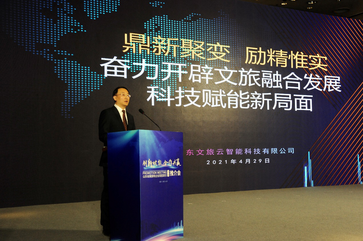 国欣文旅系山东省“十强”产业集群(精品旅游)领军企业,聚力打造平台文旅、智慧文旅、精品文旅、生态文旅“四个文旅”,而“好客山东 云游齐鲁”正是平台文旅中的智慧旅游平台。推介会现场,国欣文旅旗下山东文旅云智能科技有限公司总经理于庆以“鼎新聚变 励精惟实——奋力开辟文旅融合发展科技赋能新局面”为主题,对项目进行了精彩推介。