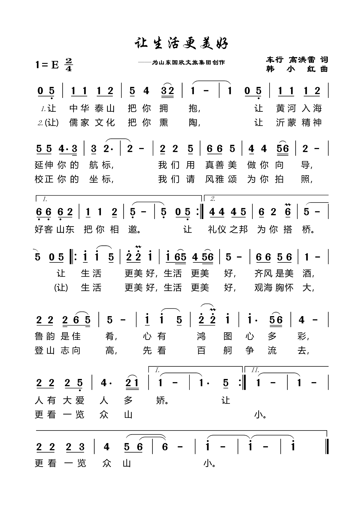 《让生活更美好》是由国欣文旅携手一线艺术创作团队共同打造的一首悦耳动听的抒情歌曲,由空军政治部文工团创作室主任、中国音乐文学学会副主席车行,鲁商集团党委书记、董事长兼国欣文旅党委书记、董事长高洪雷作词,青年作曲家韩小红作曲。