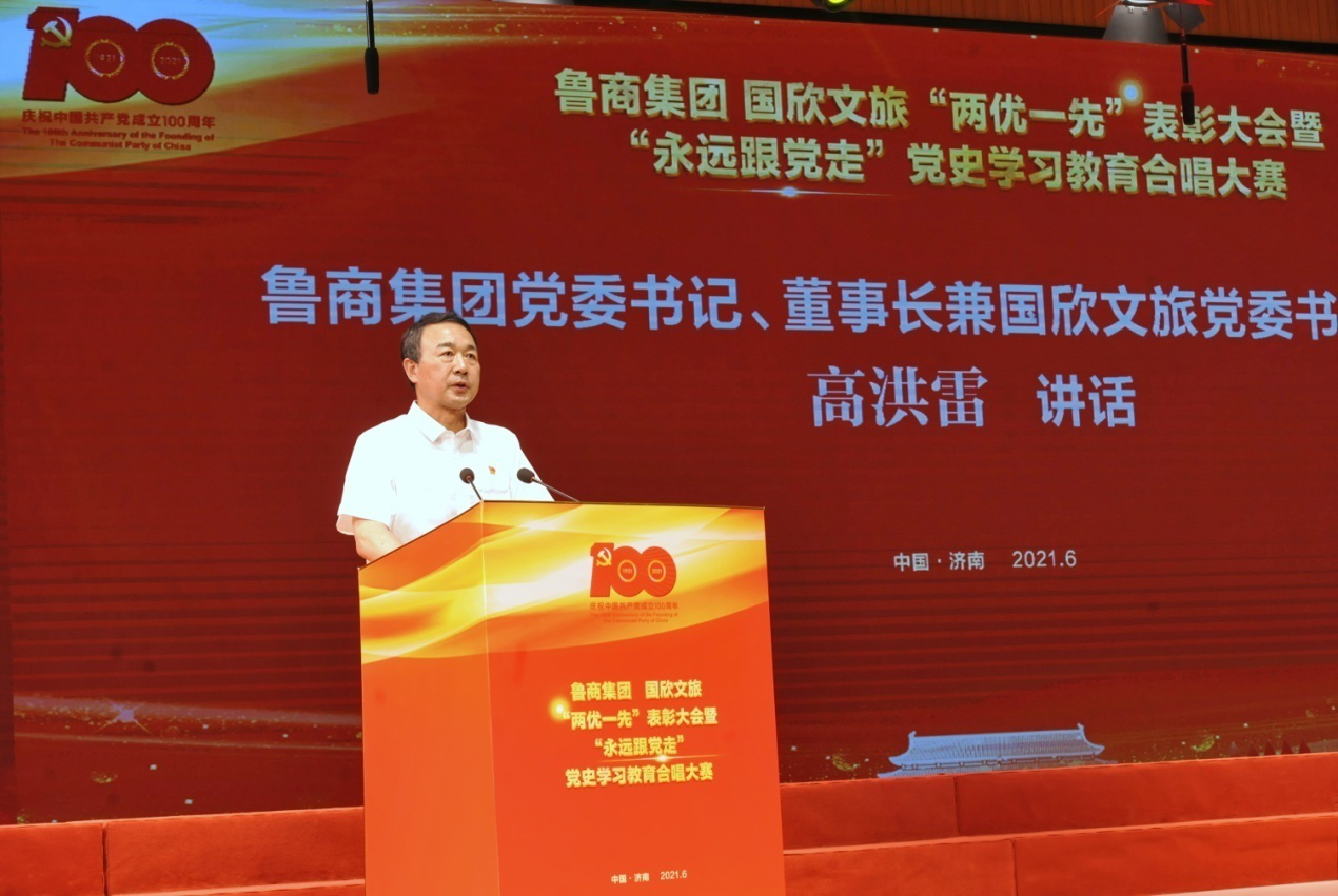 为庆祝中国共产党成立100周年,6月23日,国欣文旅举行 “两优一先”表彰大会暨“永远跟党走”党史学习教育合唱总决赛。鲁商集团党委书记、董事长兼国欣文旅党委书记、董事长高洪雷出席活动并讲话。