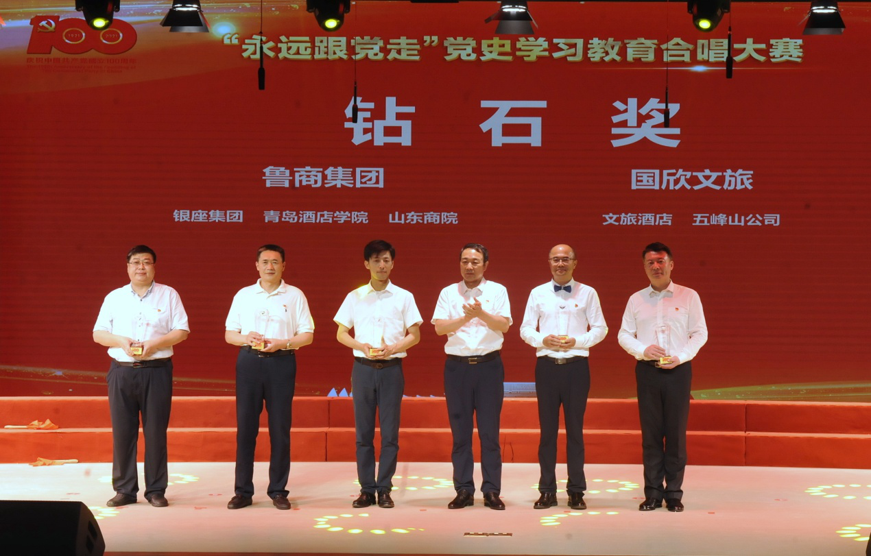 在随后举行的“永远跟党走”党史学习教育合唱大赛总决赛环节,晋级决赛的4支参赛队伍为现场观众带来了一场精彩绝伦的视听盛宴。经过激烈角逐,最终山东文旅酒店集团、五峰山公司获得“钻石奖”,乡发展集团、山东文旅投资集团获得“金奖”。参与此前大合唱预赛的山东文旅景区集团、青岛高尔夫公司、山东文旅传媒集团、省旅游设计院获得“银奖”。