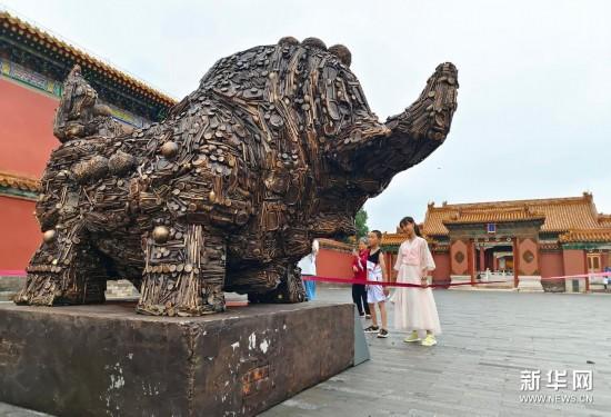 这是故宫内展出的《福牛辞“旧”》废弃物再生雕塑(7月13日摄)。新华社记者 金良快 摄