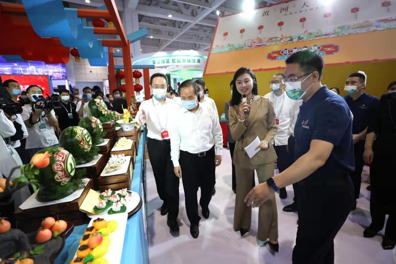 16日上午,开幕当日,省委常委、宣传部部长白玉刚等领导参加开幕式并重点参观了红色、沿黄文旅主题展区。在展区内,与内蒙古展团展商、山东文旅鲁菜馆非遗传承人进行交流。