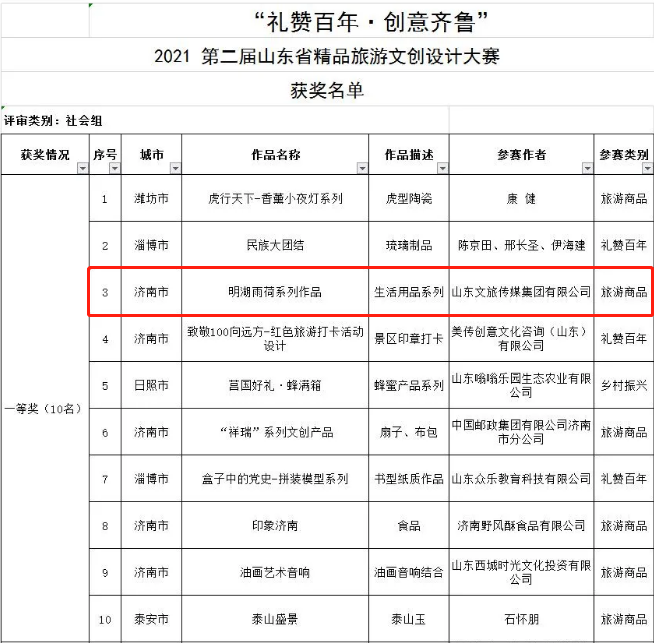 10月21日,“礼赞百年·创意齐鲁 2021第二届山东省精品旅游文创设计大赛”获奖名单公布,山东文旅传媒集团及旗下媒体选送的作品获得三个奖项。