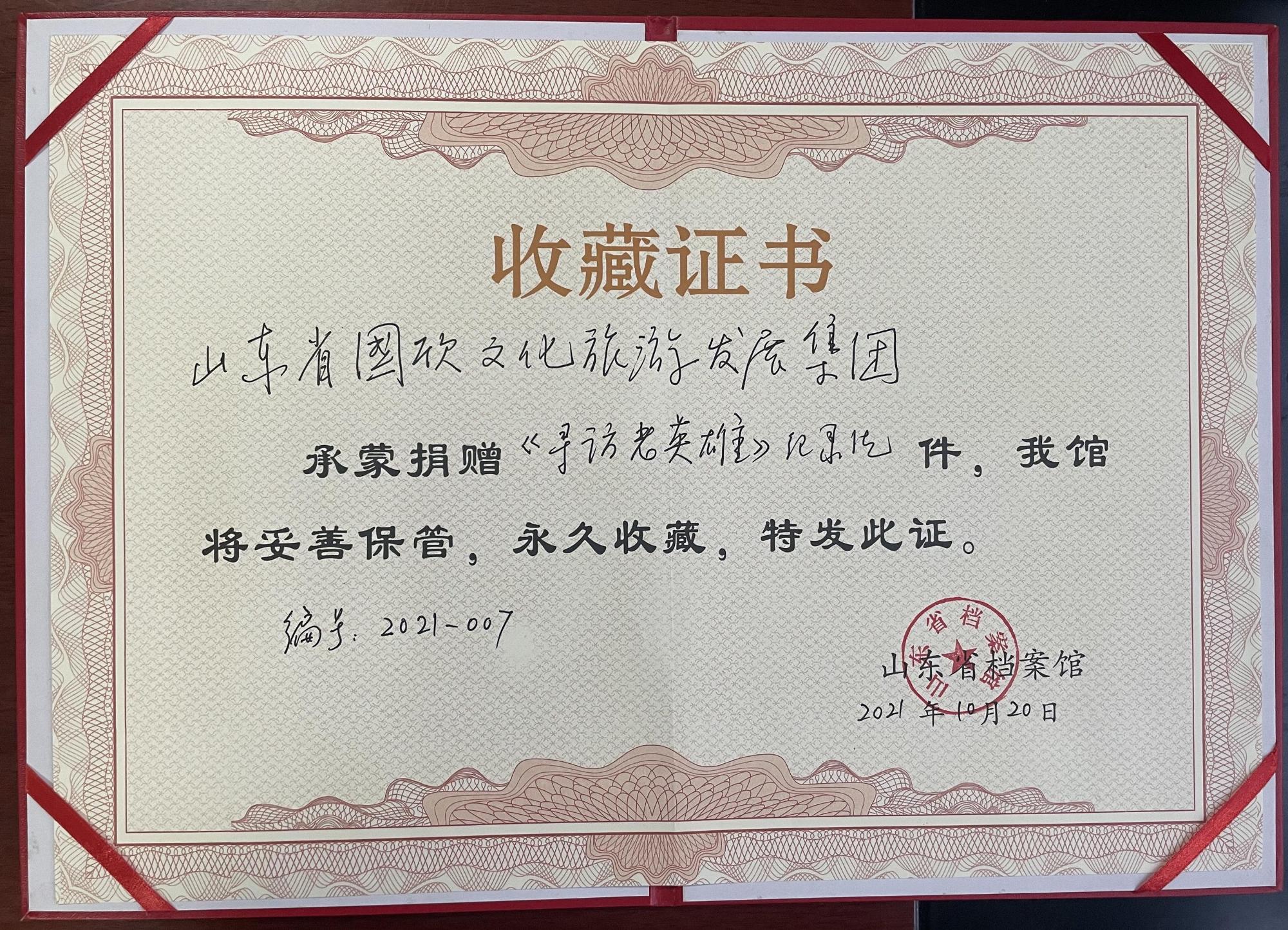 为再现峥嵘岁月,致敬英雄模范,从老党员的故事中汲取前行力量,献礼中国共产党成立100周年,由山东省国欣文化旅游发展集团有限公司(简称“国欣文旅”)联合出品的30集《寻访老英雄》纪录片于7月至8月在“学习强国”平台展播。展播后,30位老英雄的革命事迹受到了社会各界的广泛关注。近日,《寻访老英雄》纪录片的影像资料被山东省档案馆永久收藏。