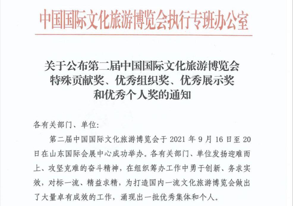 为表彰优秀,鼓励创新,日前,中国国际文化旅游博览会执行专班下发《关于公布第二届中国国际文化旅游博览会特殊贡献奖、优秀组织奖、优秀展示奖和优秀个人奖的通知》。其中,国欣文旅荣获“优秀组织奖”和“优秀展示奖”双荣誉,旗下山东文旅酒店集团、山东文旅传媒集团、《山东商报》社荣获“优秀组织奖”,山东文旅鲁菜馆精品鲁菜展荣获“优秀展示奖”,《山东商报》社总经理刘茂玉荣获“优秀个人奖”。