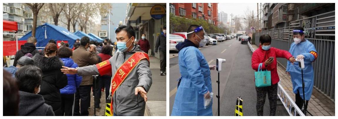 为确保安全、提高效率,志愿者们持续引导大家准备好身份证和“健康码”,保持安全距离,全程佩戴口罩,检测完毕立即离开。志愿者们全天坚守岗位,为居民做好服务保障工作,以实际行动为群众办实事。领队王新芳是一名退伍军人,他身穿防护服忙前忙后,当天气温很低,身上早已湿透,他说,作为一名党员和退伍军人,时刻准备冲锋在一线。