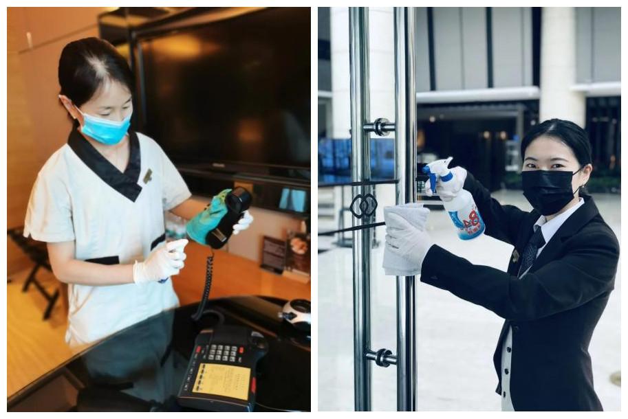 公司党委书记、董事长在公司服务群、经营群,根据实际情况,实时调度,叮嘱员工加强安全防护,确保自身和宾客安全。各区域酒店积极行动,组织发动全体员工严格落实防疫措施。从公司第一责任人到一线岗位的普通员工,时刻密切关注疫情形势,层层落实,严密防护,筑牢酒店安全防线。