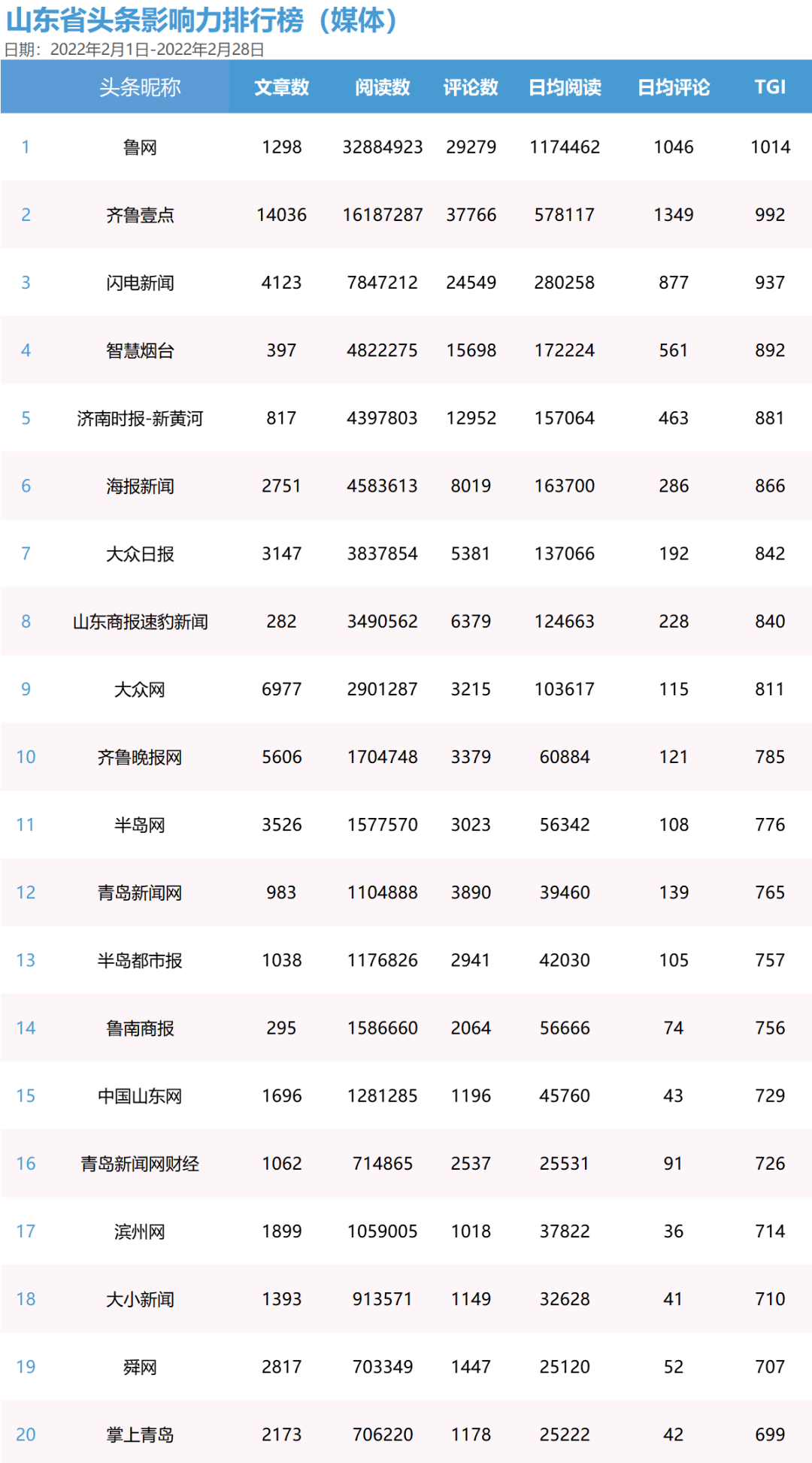 山东省头条影响力排行榜(媒体)在2月份的数据分析中介绍,传播效果方面,“鲁网”阅读数达3288万,为第二名账号阅读数的两倍,以1014的TGI值位列第一,成为榜单中唯一TGI值突破1000的账号。