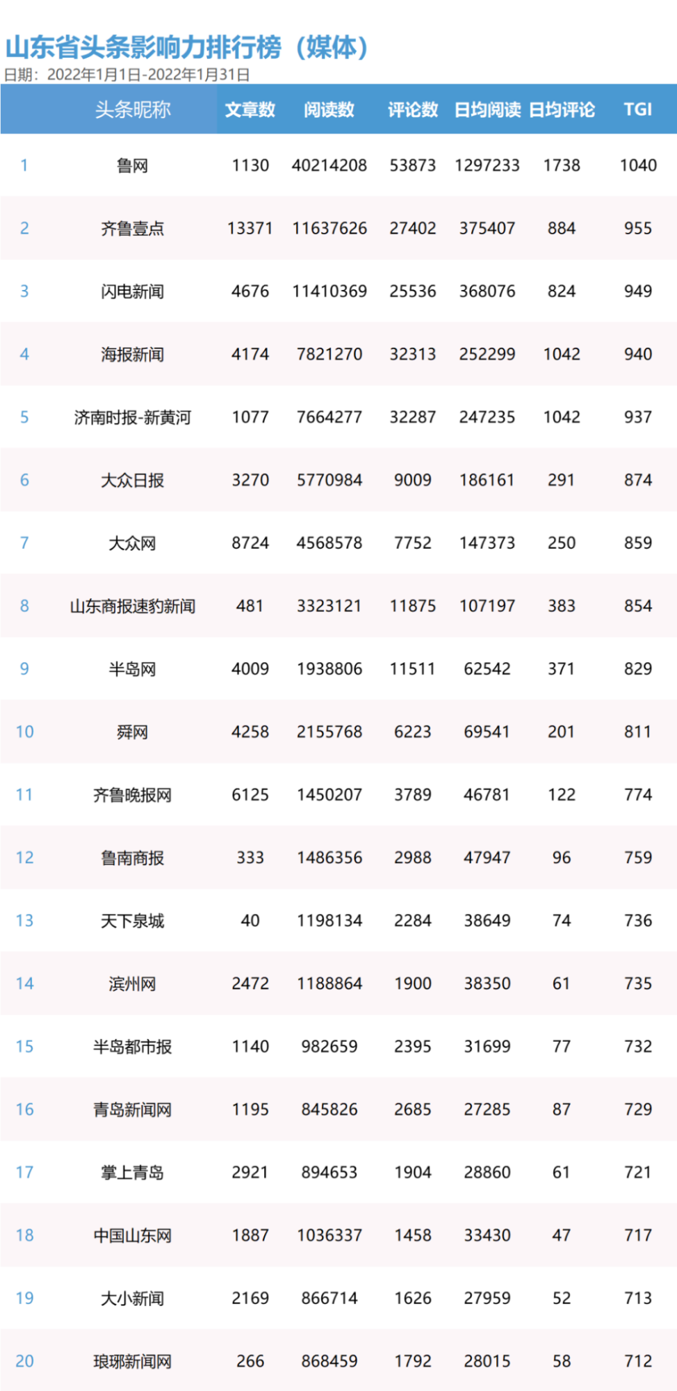 在此前发布的1月份山东省头条影响力排行榜(媒体)中,“鲁网”均篇传播效果最佳,篇均阅读量突破3万,共获得4021万阅读量、129万日均阅读量和5万评论数,超过榜单中其他媒体账号,以1040的TGI值位列第一。