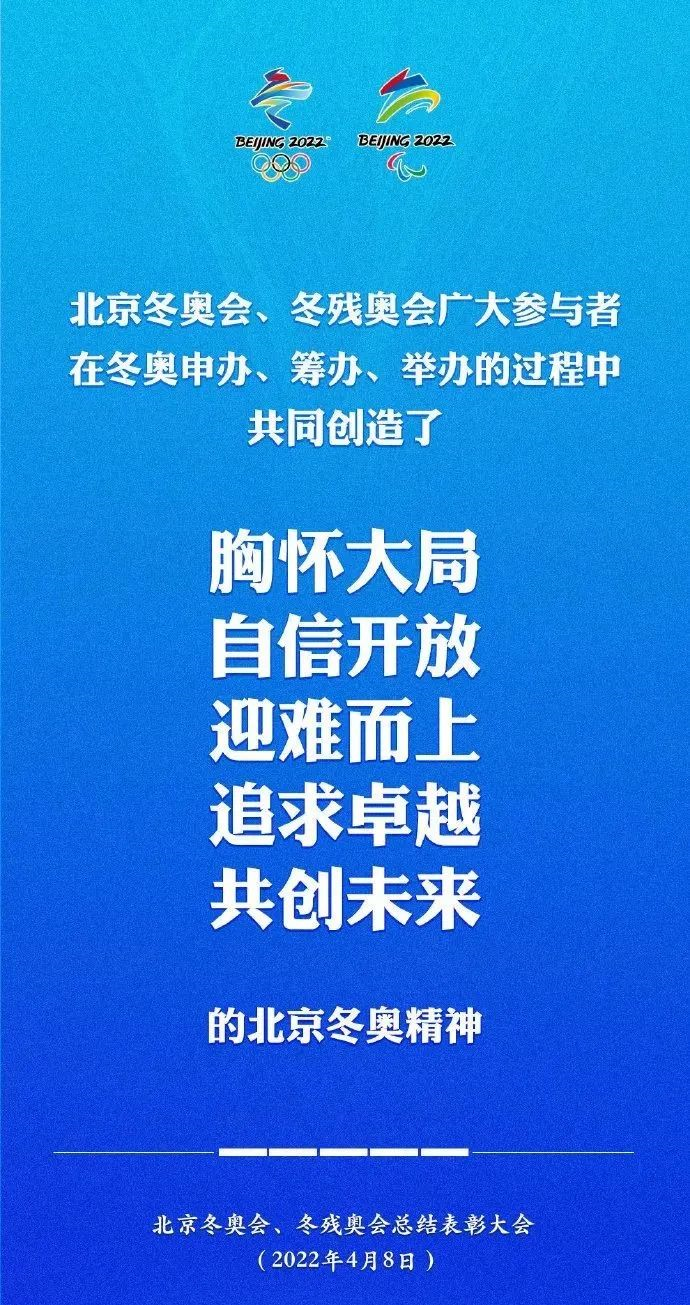4月8日上午,北京冬奥会、冬残奥会总结表彰大会在人民大会堂隆重举行。习近平总书记在讲话中指出,伟大的事业孕育伟大的精神,伟大的精神推进伟大的事业。北京冬奥会、冬残奥会广大参与者珍惜伟大时代赋予的机遇,在冬奥申办、筹办、举办的过程中,共同创造了胸怀大局、自信开放、迎难而上、追求卓越、共创未来的北京冬奥精神。
