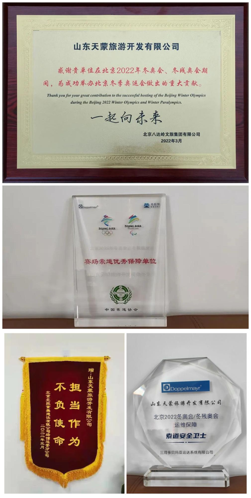 与冰雪相会、与冬奥结缘,山东天蒙旅游开发有限公司有幸参与2022年北京冬奥运、冬残奥会赛场索道运营管理工作,并在4月2日由中国索道协会和北京八达岭文旅集团有限公司在北京延庆冬奥驻地召开的冬奥索道服务保障总结大会中,天蒙公司荣获由中国索道协会、三河多贝玛亚运送系统有限公司颁发的“赛场索道优秀保障单位”“北京2022冬奥会/冬残奥会运维保障索道安全卫士”等荣誉,并收获由北京八达岭文旅集团有限公司颁发的牌匾和由北京北控京奥建设有限公司场馆运营分公司颁发的“担当作为 不负使命”锦旗,天蒙山索道站团队专业、高效的冬奥索道服务保障受到赛事各方的充分肯定。