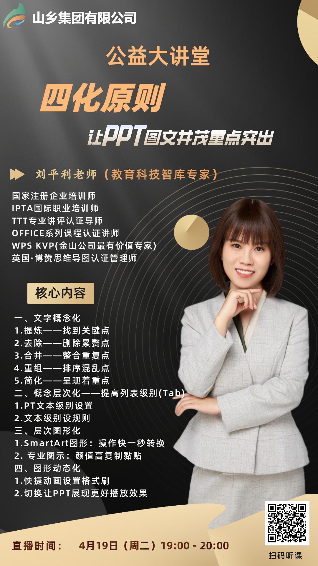 “干货满满!”“太给力了!讲得太好了!”“时间太短,没听够!”4月19日,由山乡集团有限公司(简称“山乡集团”)所属教育科技公司承办的2022年“助力成长,企业赋能”山乡集团首期公益大讲堂正式开讲。首期大讲堂邀请了国家注册企业培训师、IPTA国际职业培训师、TTT专业讲评认证导师刘平利作题为《四化原则——让PPT图文并茂重点突出》的精彩授课。