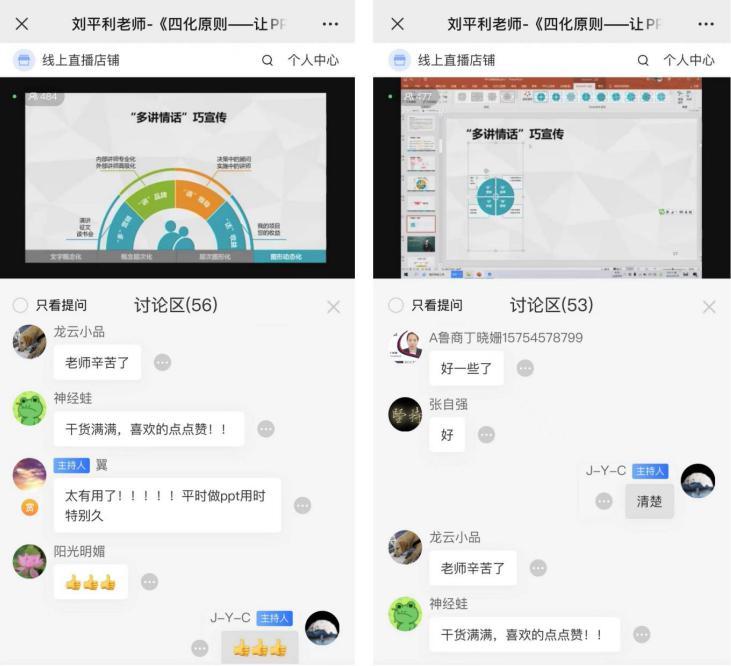 技能满分,实用性强!刘平利老师在授课过程中逻辑严谨、结构清晰,极具亲和力和感染力。通过导入纲要加演绎再配合互动,将理论讲解与实战案例结合,并运用对比、举例等方式,简洁明了地将PPT制作技巧呈现给大家,方便学员更好地学习、记忆和使用。本次线上课程取得了圆满成功,学员们表示收获颇丰,既提高了技术应用能力,又提升了个人信息素养,希望教育科技公司能够给大家带来更多精彩课程。