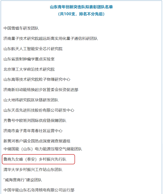 近日,团省委、省青联评选出100支“山东青年创新突击队”和100名“山东青年创新榜样”。山乡集团有限公司九女峰(泰安)乡村振兴先行队荣获“山东青年创新突击队”称号。此次评选,团省委、省青联围绕促进落实省委“十大创新”重点任务,旨在挖掘、宣传、展示全省各行业各领域勇于创新、敢为人先的优秀青年典型,更好激发山东青年的创新智慧、创业激情和创优动力。