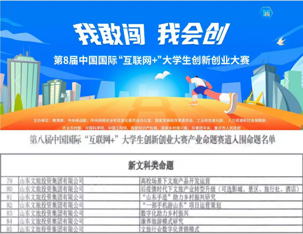 5月30日,山东文旅投资集团有限公司(以下简称“山东文旅投资集团”)申报的七项命题成功入围第八届中国国际“互联网+”大学生创新创业大赛产业命题赛道。此次大赛由教育部、中央统战部、中央网络安全和信息化委员会办公室、国家发展改革委、工业和信息化部、人力资源社会保障部、农业农村部、中国科学院、中国工程院、国家知识产权局、国家乡村振兴局、共青团中央和重庆市人民政府共同主办,属于A类(国家级)大学生学科赛事。其在全国普通高校大学生竞赛榜单内,赛事序号1。