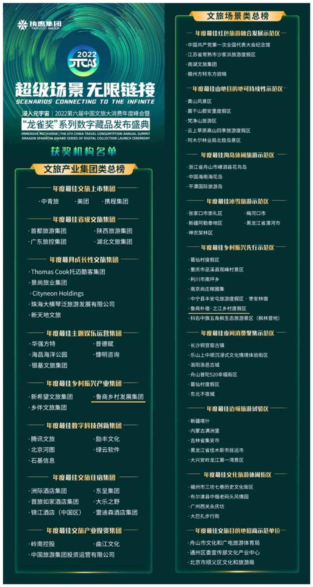 5月31日,第六届中国文旅大消费年度峰会暨“龙雀奖”颁奖盛典举办。经过激烈角逐,山乡集团有限公司(原鲁商乡村发展集团)从众多参选企业中脱颖而出斩获“年度最佳乡村振兴产业集团”奖项。山乡集团旗下杭州之江乡村度假区荣获“最佳乡村振兴先行示范区”称号。