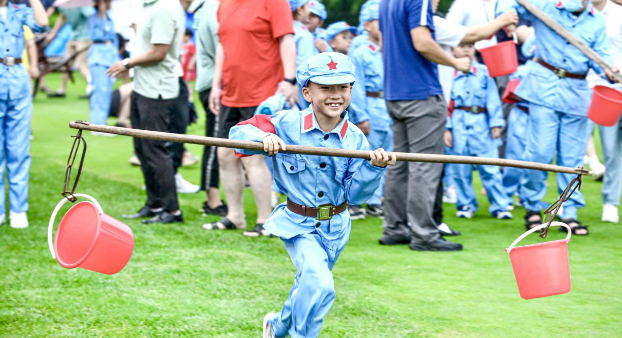 活动以中国工农红军两万五千里长征为故事背景,设置朱德的扁担、独轮车支援前线等具有标志性的道具,让参与的孩子们吃红军饭、走红军路,在沉浸式体验中感悟革命历程的艰辛,使红色研学更加鲜活生动。按照指令,孩子们踊跃应招入伍,换上崭新戎装,扛起扁担、推起独轮车,一支整齐的队伍精神抖擞地踏上征程。天空下起绵绵细雨,孩子们斗志不减,在“连长”的带领下,唱红歌、挥旗帜,脚步一刻不停。参与首场活动体验的家庭纷纷反馈,队伍爬坡过坎开启“长征路”的那一刻,在新一代青少年身上看到了对一往无前的革命精神、历尽艰险的吃苦精神的传承。