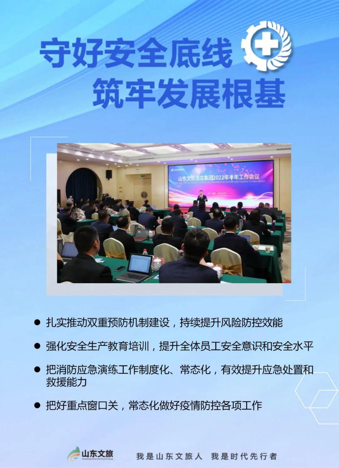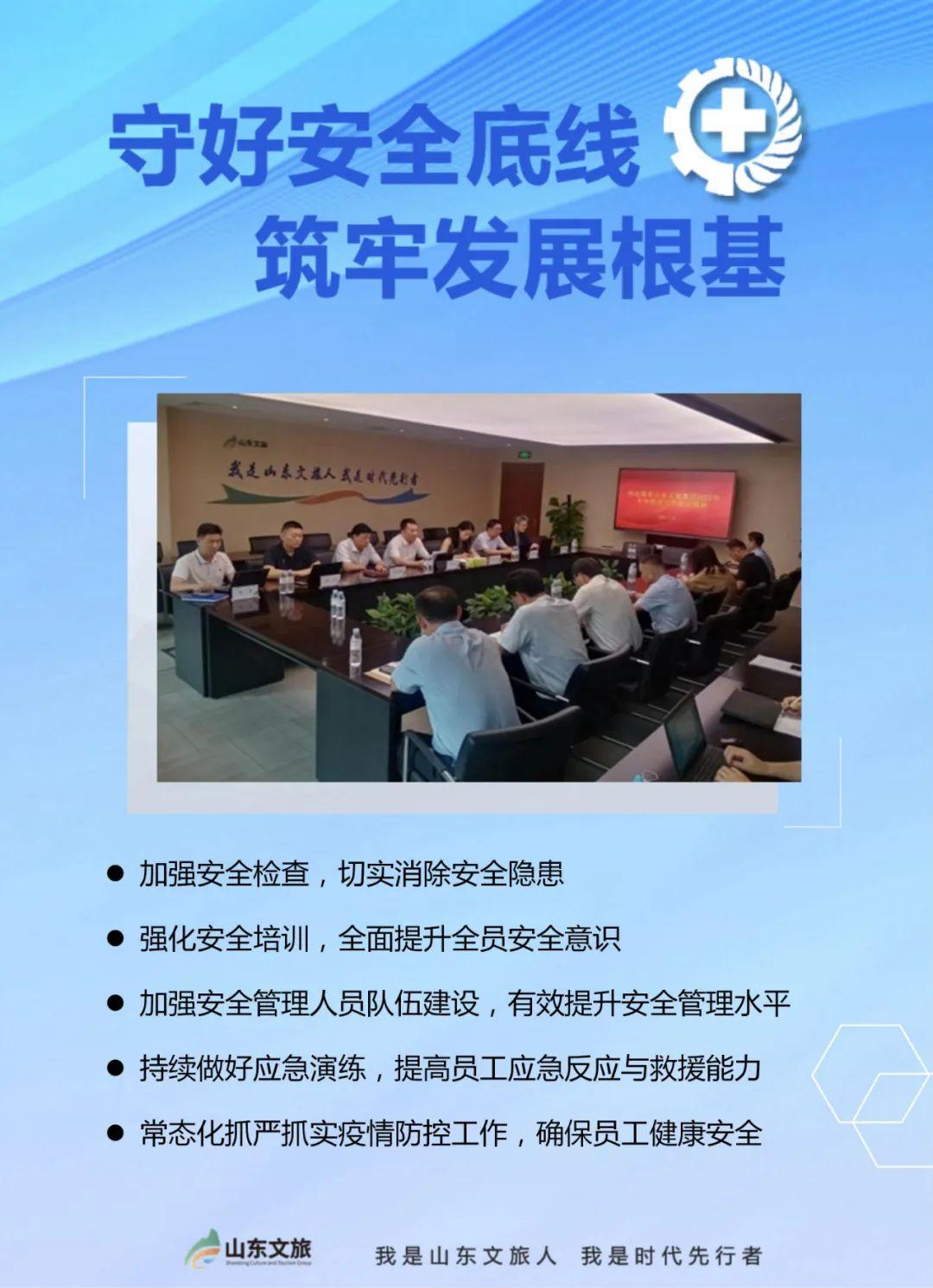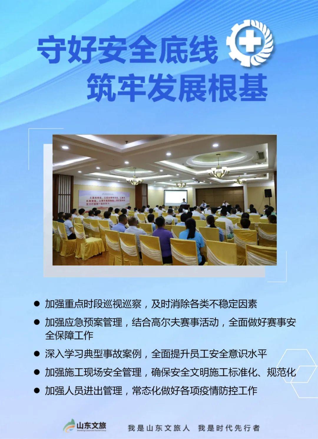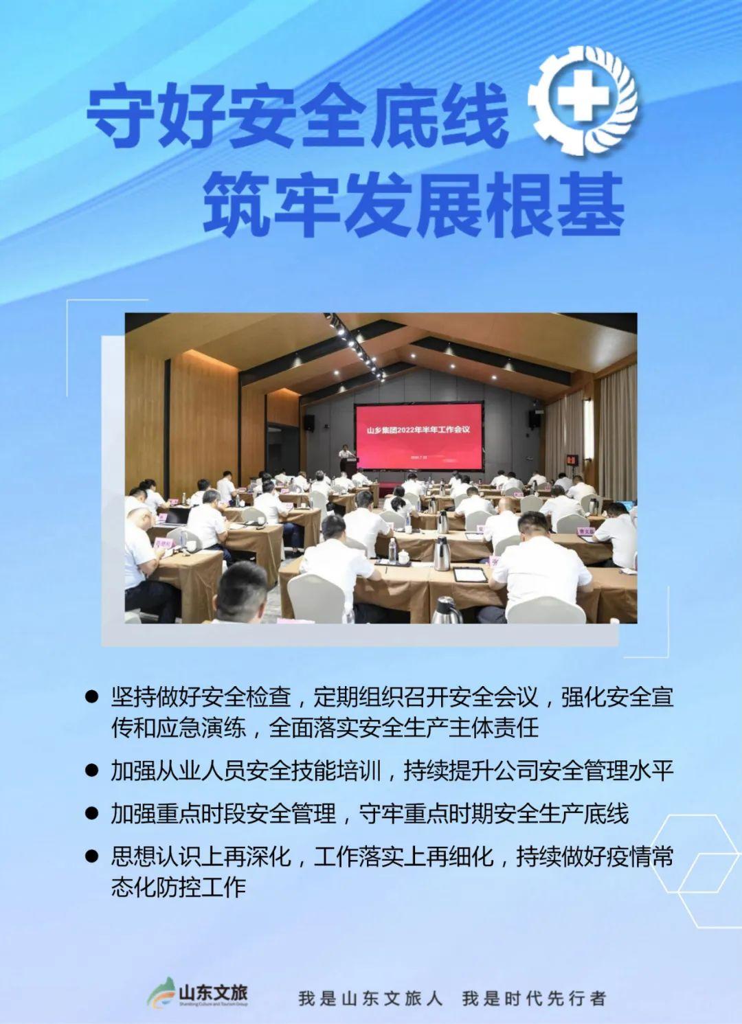 为全面做好安全生产工作,山东文旅集团在半年经济工作分析会中做了详细部署,提出了坚守两个底线的明确要求。一是守好安全生产底线,逐级压牢压实安全责任,强化制度刚性约束,严格排查风险隐患,以一万分的努力,防范万分之一的风险,确保安全生产万无一失;二是守好疫情防控底线,时刻绷紧疫情防控这根弦,抓好日常防控、应急处置、核酸检测。为贯彻落实会议要求,各权属单位及时部署,明确表态,下半年的安全工作我们这么干!