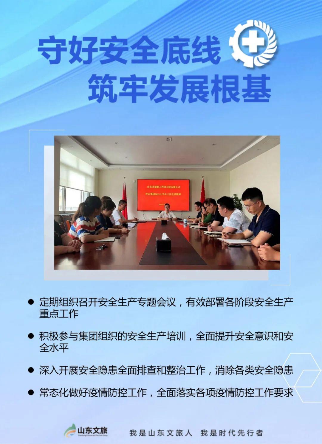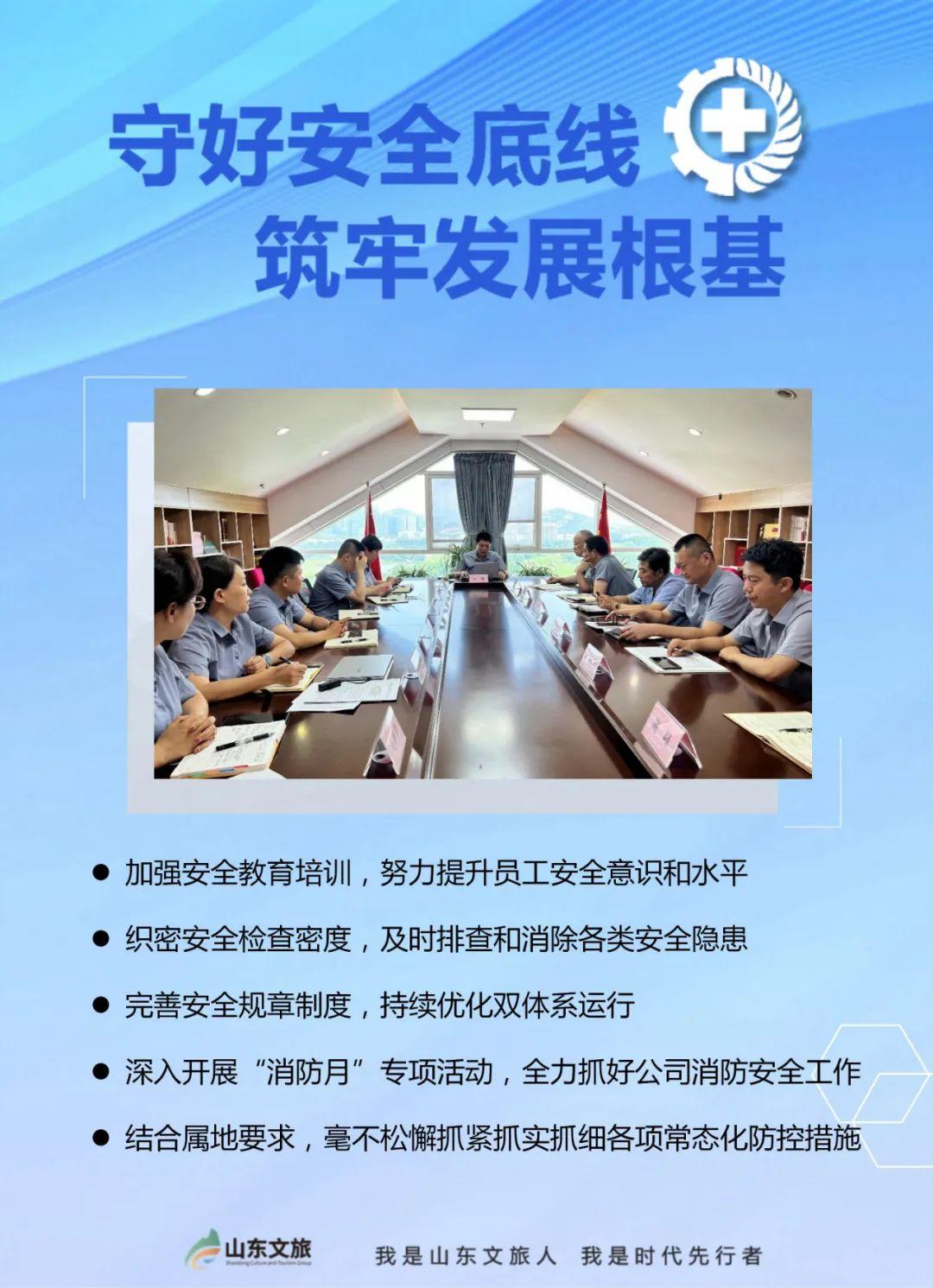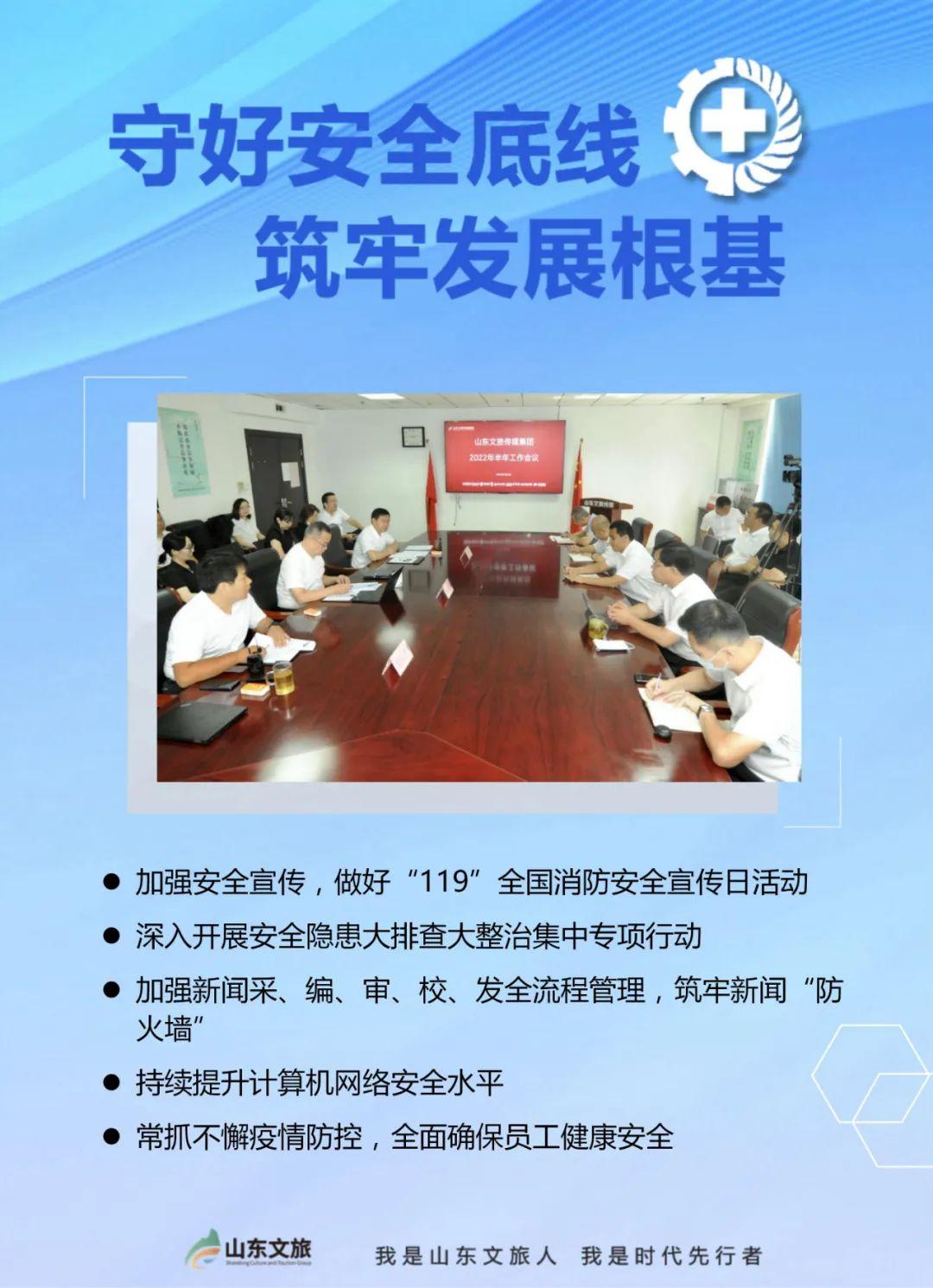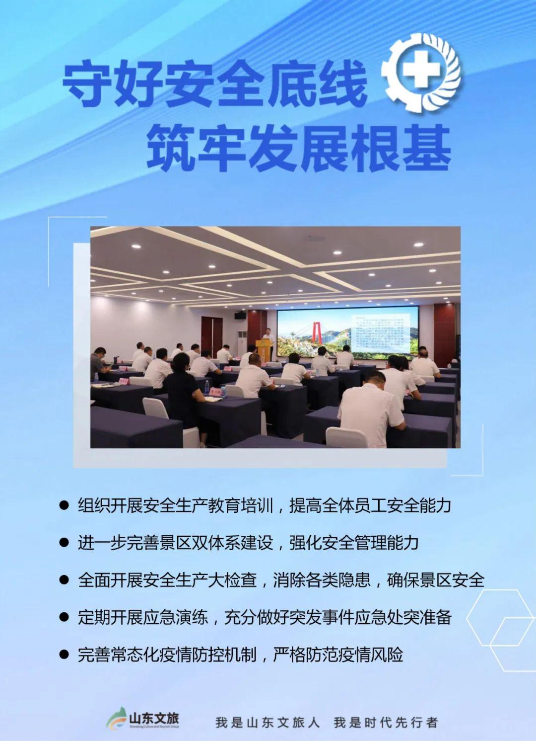 为全面做好安全生产工作,山东文旅集团在半年经济工作分析会中做了详细部署,提出了坚守两个底线的明确要求。一是守好安全生产底线,逐级压牢压实安全责任,强化制度刚性约束,严格排查风险隐患,以一万分的努力,防范万分之一的风险,确保安全生产万无一失;二是守好疫情防控底线,时刻绷紧疫情防控这根弦,抓好日常防控、应急处置、核酸检测。为贯彻落实会议要求,各权属单位及时部署,明确表态,下半年的安全工作我们这么干!