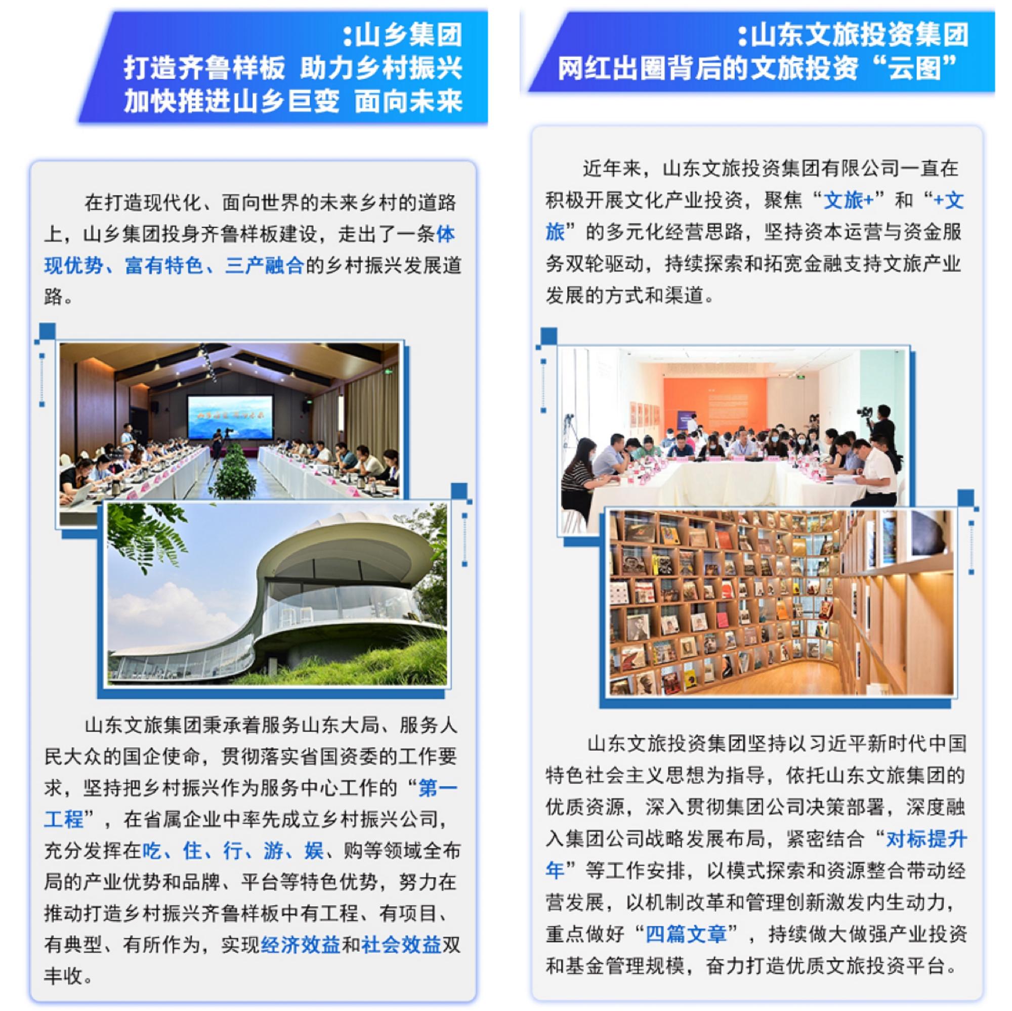 在泰山·九女峰,山乡集团党委委员、工会主席于在武介绍了打造乡村振兴齐鲁样板的经验做法。在信尚美术馆,山东文旅投资集团总经理杨林介绍了积极开展文化产业投资、聚焦“文旅+”“+文旅”的多元化经营思路。