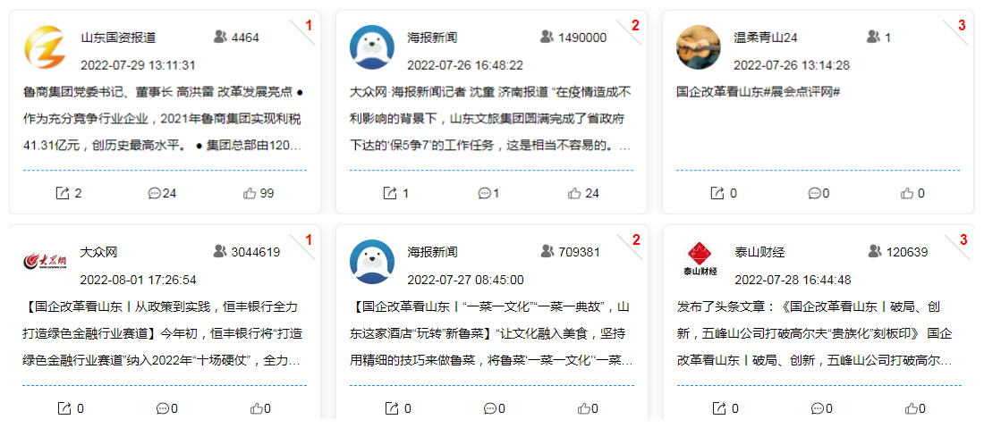 聚焦山东国企改革,包括人民日报、新华社、光明日报、经济日报、中国日报、科技日报、中国证券报·中证网、中国经济周刊、工人日报、中国青年报、中国发展改革报、中国旅游报、人民网、新华网、中国网、光明网、大众日报客户端、大众网·海报新闻、齐鲁网·闪电新闻、新浪、搜狐、今日头条、抖音等央级、省级重点新闻媒体、商业网站、客户端以及社交平台的高度关注,多家主流媒体通过文字+图片、文字+音视频等报道形式,对活动进行全方位、立体式、多样化报道,收到良好传播效果。