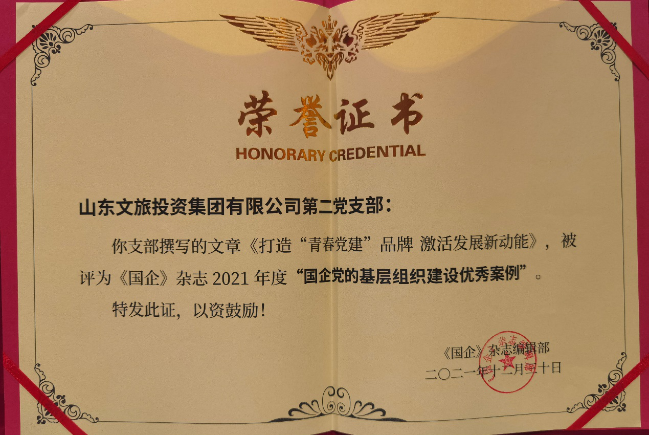 同时,在近期省国资委党委举办的“以高质量党建引领省属企业高质量发展”推进会上,山东文旅集团所属山东文旅投资集团有限公司第二党支部被颁发“国企党的基层组织建设优秀案例”荣誉证书。