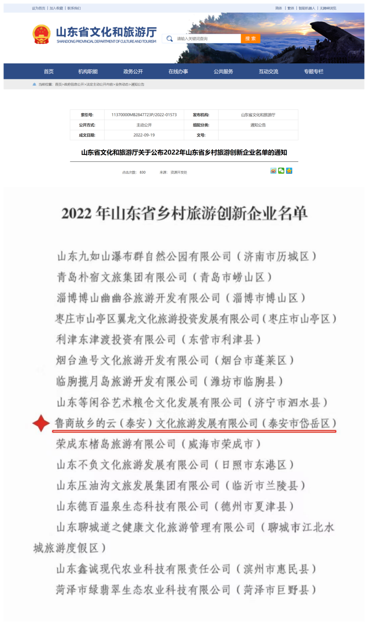 近日,省文化和旅游厅公布2022年山东省乡村旅游创新企业名单,山乡集团故乡的云(泰安)文化旅游发展有限公司(简称“故乡的云公司”)成功入选。
