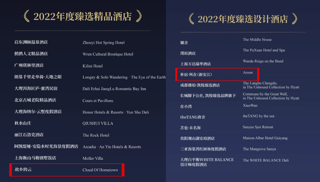 近日,2022年度第六届HOTEL探索之旅酒店大赏颁奖典礼在上海举行,山乡集团两项目获奖。位于泰山·九女峰乡村振兴示范区的“故乡的云”高端野奢度假酒店入选“2022年度臻选精品酒店”,位于杭州之江乡村度假区的朴宿·所在(新安江)精品度假酒店入选“2022年度臻选设计酒店”。