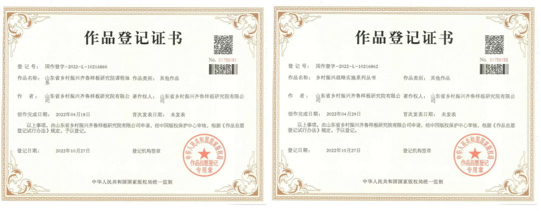 近日,山东省乡村振兴齐鲁样板研究院(简称“研究院”)《乡村振兴战略系列丛书》《山东省乡村振兴齐鲁样板课程体系》获得国家版权局颁发的著作权登记证书,《乡村振兴两院一体“461”运营体系》《乡村振兴项目申报服务体系》《乡村振兴利益联结机制服务体系》《乡村振兴策划规划服务体系》等6项研究成果获得国家版权局颁发的计算机软件著作权登记证书。