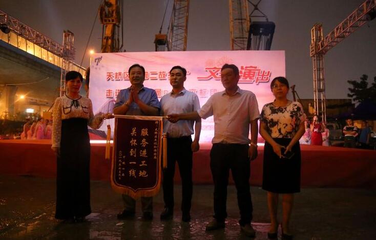 演出开始前,天桥区文旅局和轨道交通指挥部领导为工人们赠送毛巾,让工人们感受到来自社会和党的温暖关怀。中铁四局R线六标段党工委书记徐松为天桥区文旅局赠送锦旗。