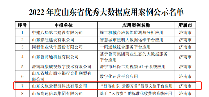 近期,山东文旅云智能科技有限公司(简称“文旅云公司”)喜讯频传。由文旅云公司承建的“好客山东 云游齐鲁”智慧文旅平台入选山东省工业和信息化厅组织评选的“三优两重项目”名单(2022年度山东省优秀大数据应用案例),文旅云公司入选山东省工业和信息化厅组织评选的“2022年度山东省创新型中小企业”名单。同时,文旅云公司总经理曲磊荣获由山东省数字经济协会评选的2022年度山东省大数据产业“领军人物”。