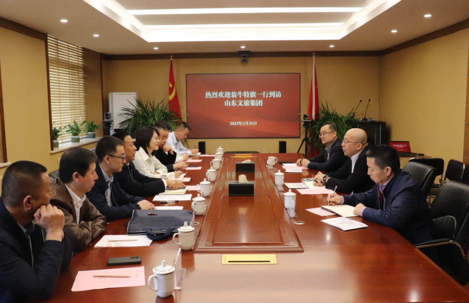 孙超邀请高永武一行观看山东文旅形象宣传片,并同考察团座谈交流。他介绍了山东文旅集团的发展脉络、业务布局、经营思路等情况,重点介绍了集团景区投资、文化传媒、乡村振兴、规划设计等相关情况。目前,山东文旅集团正着力打造平台企业,在景区开发、乡村振兴、黄河战略、非遗手造等领域同翁牛特旗存在一系列业务结合点,期待双方共同把握机遇,互利共赢。