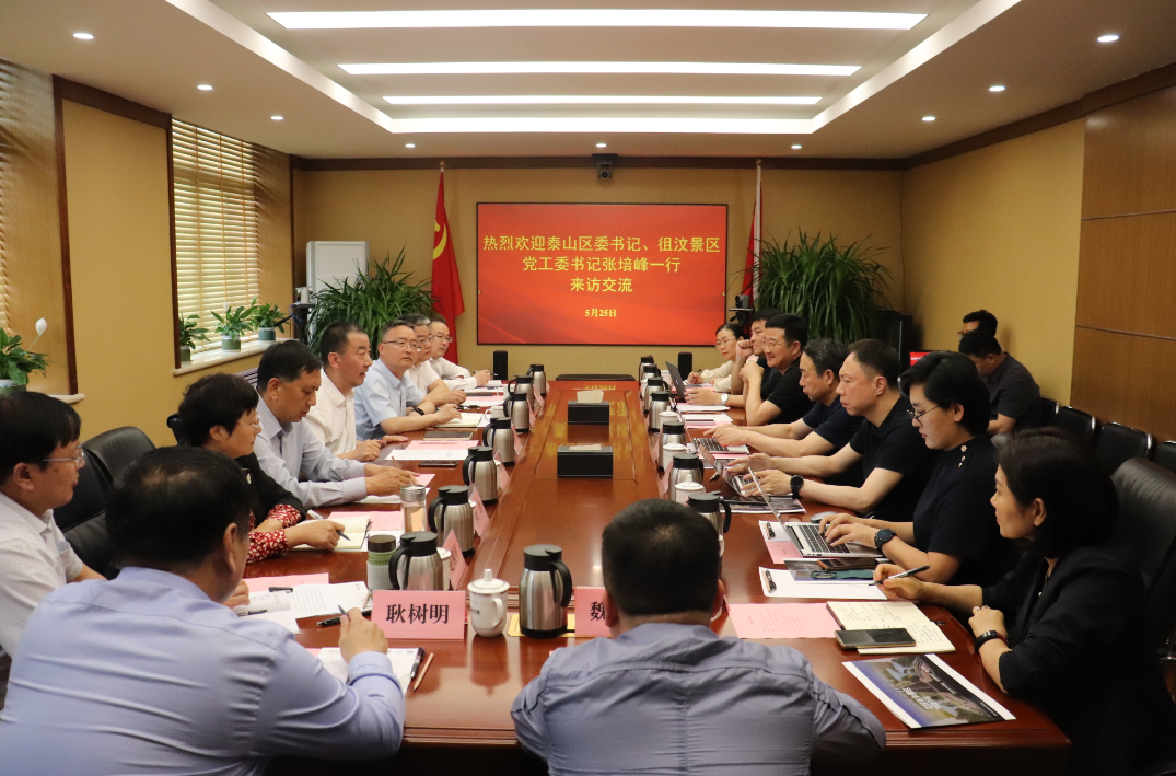 5月25日,泰安市泰山区委书记、徂汶景区党工委书记张培峰率队到山东文旅集团座谈交流,集团党委书记、董事长高洪雷会见。山东文旅集团党委副书记、总经理丁艺,泰安市泰山区委副书记、区长周鹏飞参加会谈。